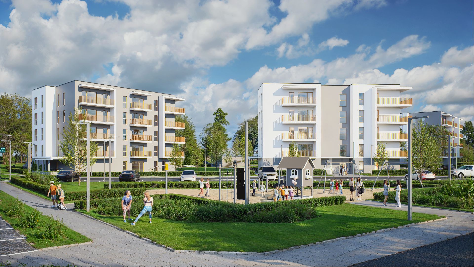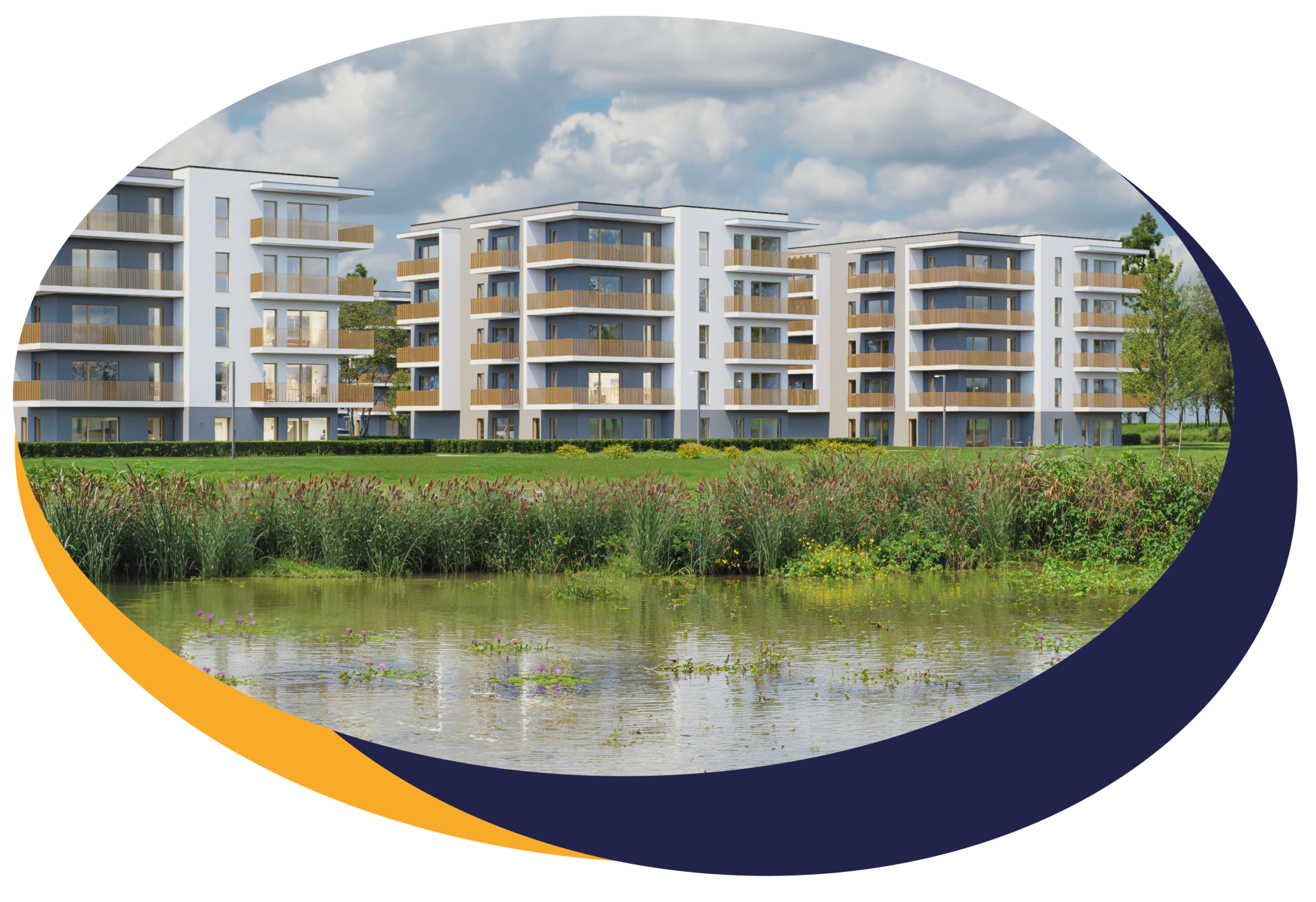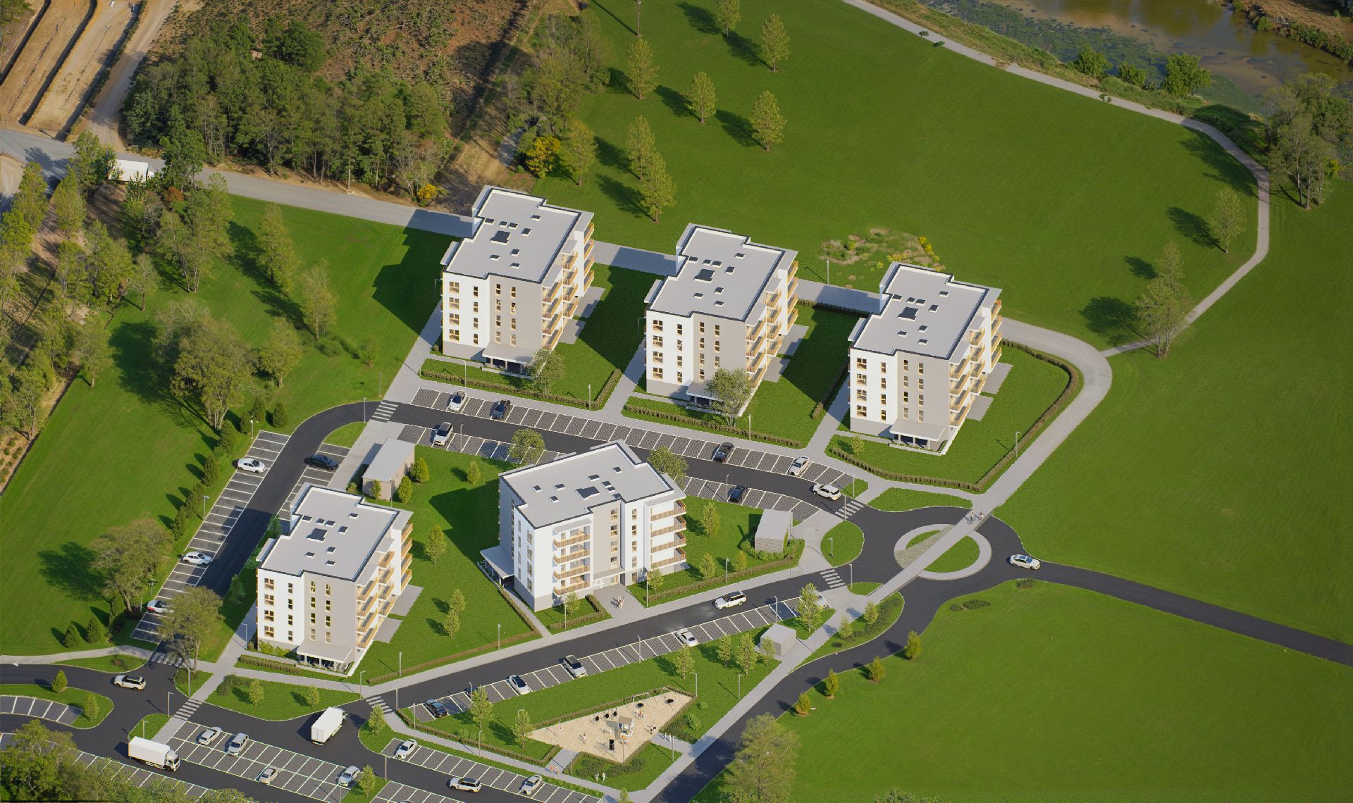 Na terenie 12 hektarów powstaje kompleks 19 budynków mieszkalnych, zaprojektowanych z myślą o harmonii z otaczającym krajobrazem. Wyjątkowym atutem osiedla jest park o powierzchni 3,5 hektara z dwoma stawami oraz infrastrukturą rekreacyjną. Woda i zieleń są tu naturalnym elementem codziennego życia.