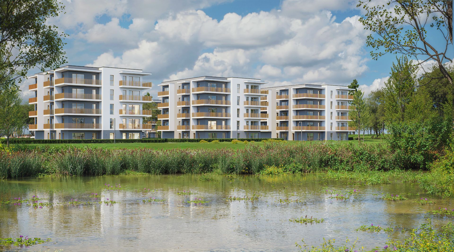 W południowej części inwestycji położone są także stawy o powierzchni 3,2 hektara z zaplanowaną przystanią dla kajaków i rowerów wodnych. Dbamy o obecny drzewostan, a także rozpoczynamy nasadzenia drzew – głównie rodzimych gatunków, dobranych z myślą o lokalnym ekosystemie.